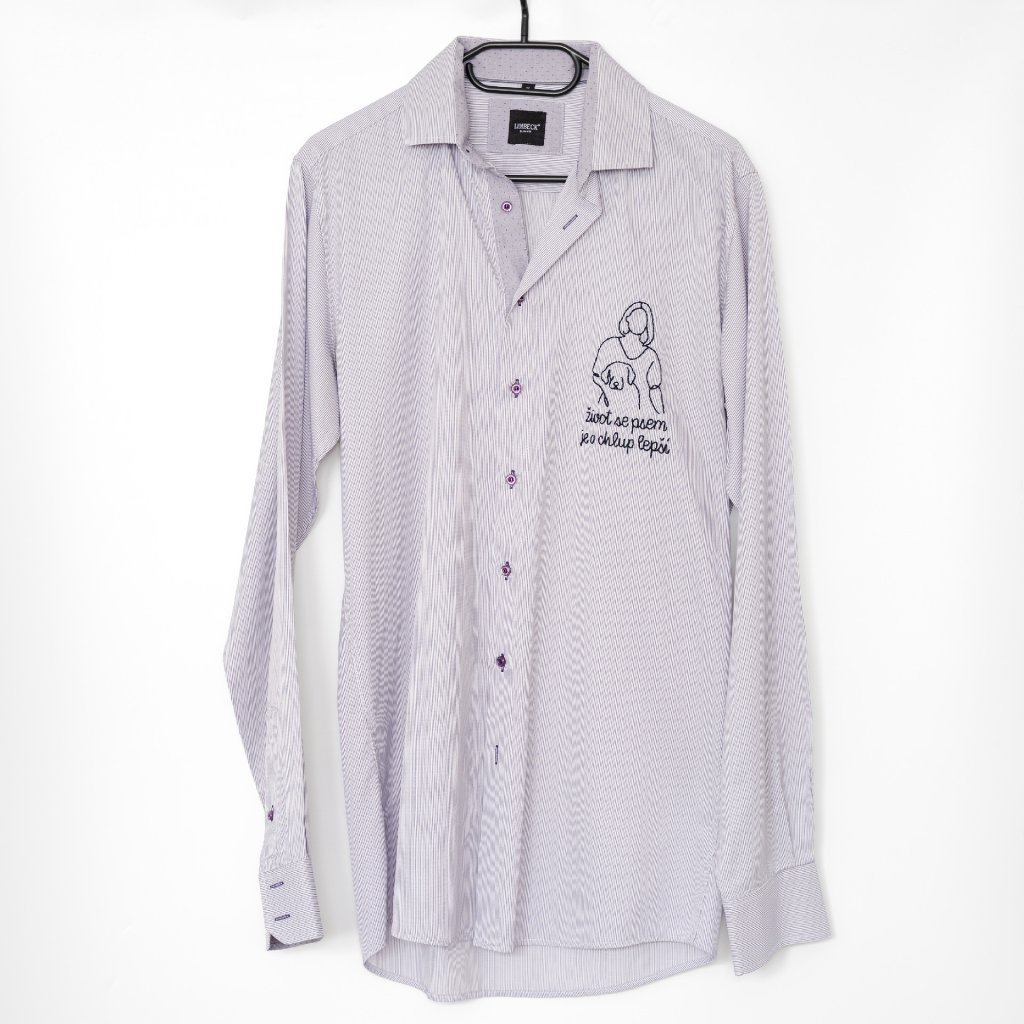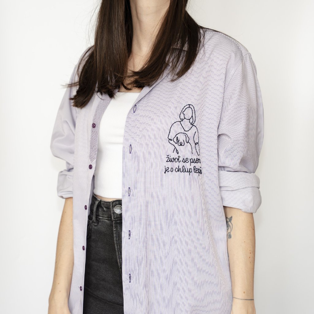 Každý, kdo má psa, ví, že jejich věrnost, radost a bezpodmínečná láska dokážou rozzářit i ten nejobyčejnější den. Tahle upcyklovaná košile s autorskou výšivkou je oslavou všech čtyřnohých parťáků. Bez nich by byl svět o hodně prázdnějším a smutnějším místem. Zkrátka se psem je život o chlup lepší! Kousku, na němž je motiv vyšitý, můžete svou koupí dát druhou šanci. Zároveň si můžete být jistí, že se ve vaše šatníku usídlí originál, protože každý můj výrobek se trochu liší od předchozího a žádné dva nejsou stejné.